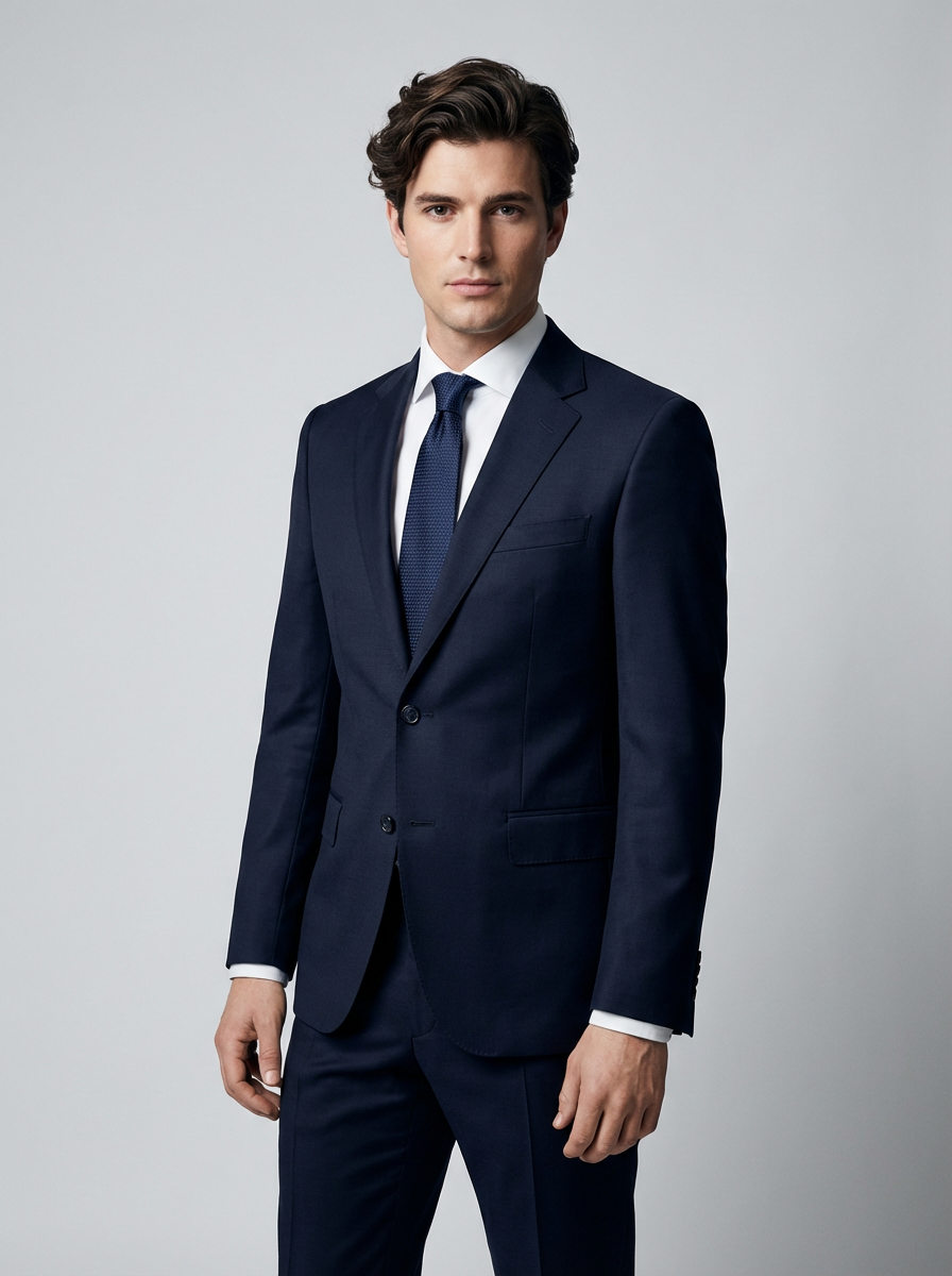full body photo of model is looking directly at the camera and has styled her hair with volume and a slight wave. Wearing a elegeant suit The background is a plain, light gray color, creating a minimalist setting.