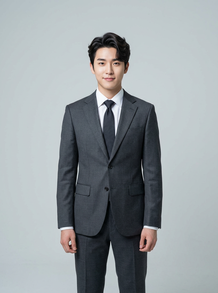 full body photo of model is looking directly at the camera and has styled her hair with volume and a slight wave. Wearing a elegeant suit The background is a plain, light gray color, creating a minimalist setting.