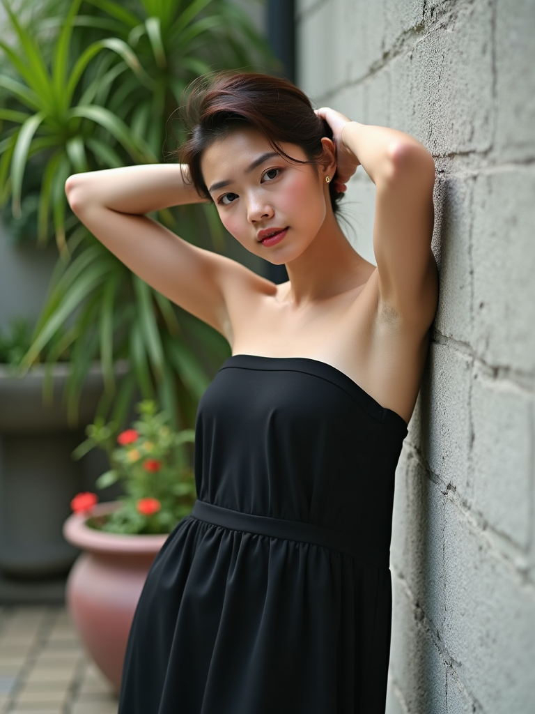 full body photo of model leaning against a textured wall outdoors. The model is wearing a black, strapless dress. The model's arms are raised with hands resting on the back of the head. The background features greenery and a planter with flowers, creating a serene garden setting. The model is facing forward with a relaxed expression.