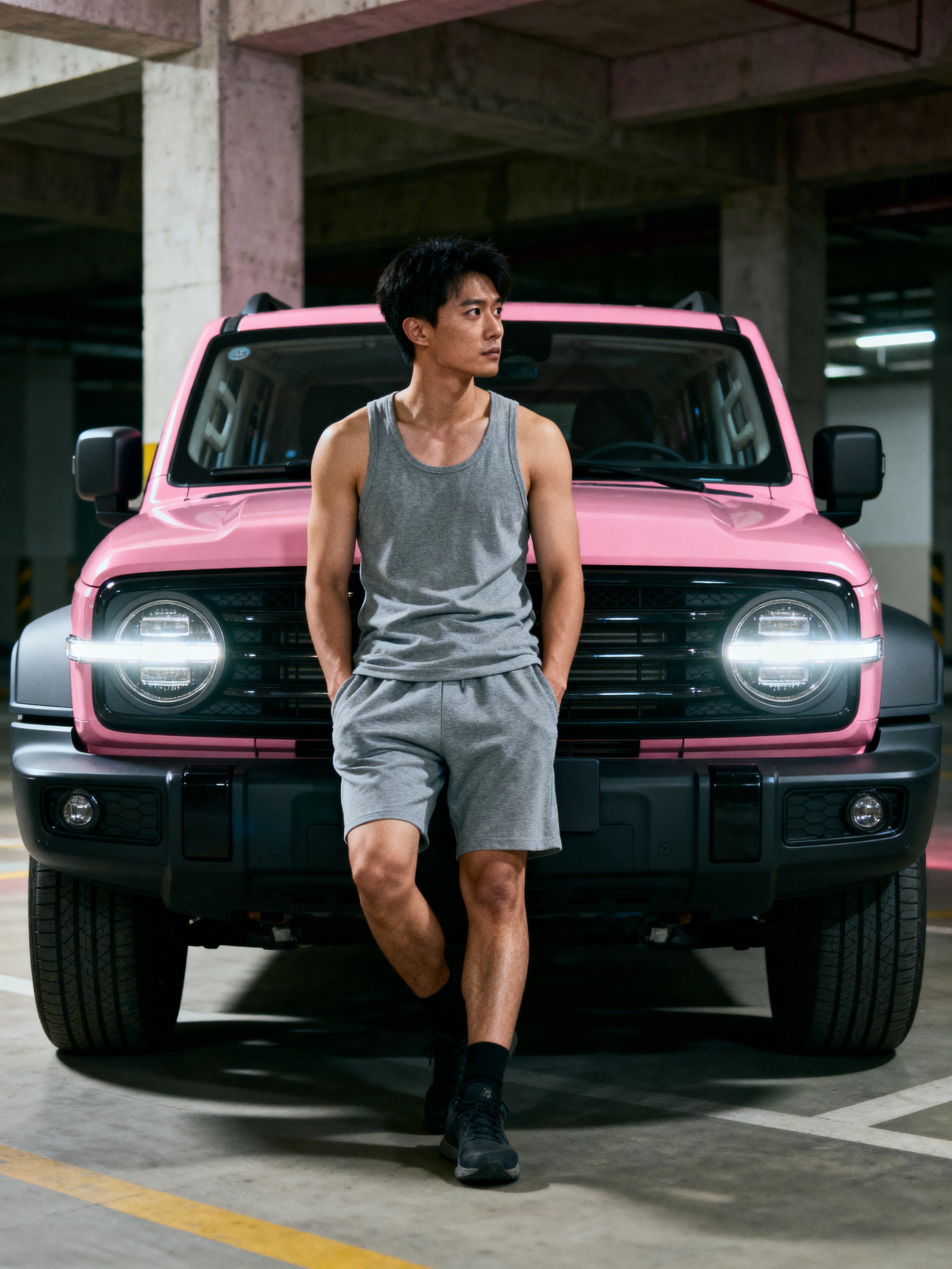 full body photo of model wearing a gray tank top and matching shorts, leaning against a pink suv. the model looks to the right. the vehicle features a modern, boxy design with a prominent front grille and round headlights. the setting is an indoor parking area with concrete columns visible in the background.