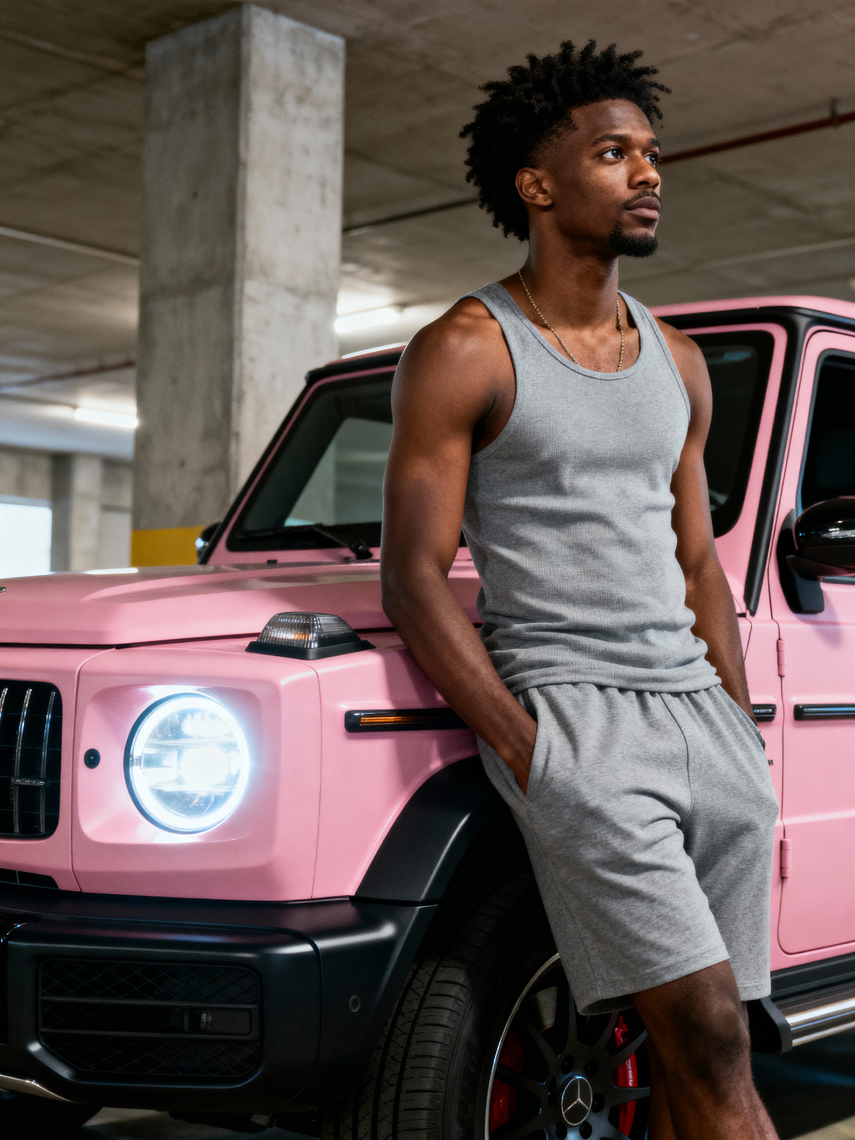 full body photo of model wearing a gray tank top and matching shorts, leaning against a pink suv. the model looks to the right. the vehicle features a modern, boxy design with a prominent front grille and round headlights. the setting is an indoor parking area with concrete columns visible in the background.