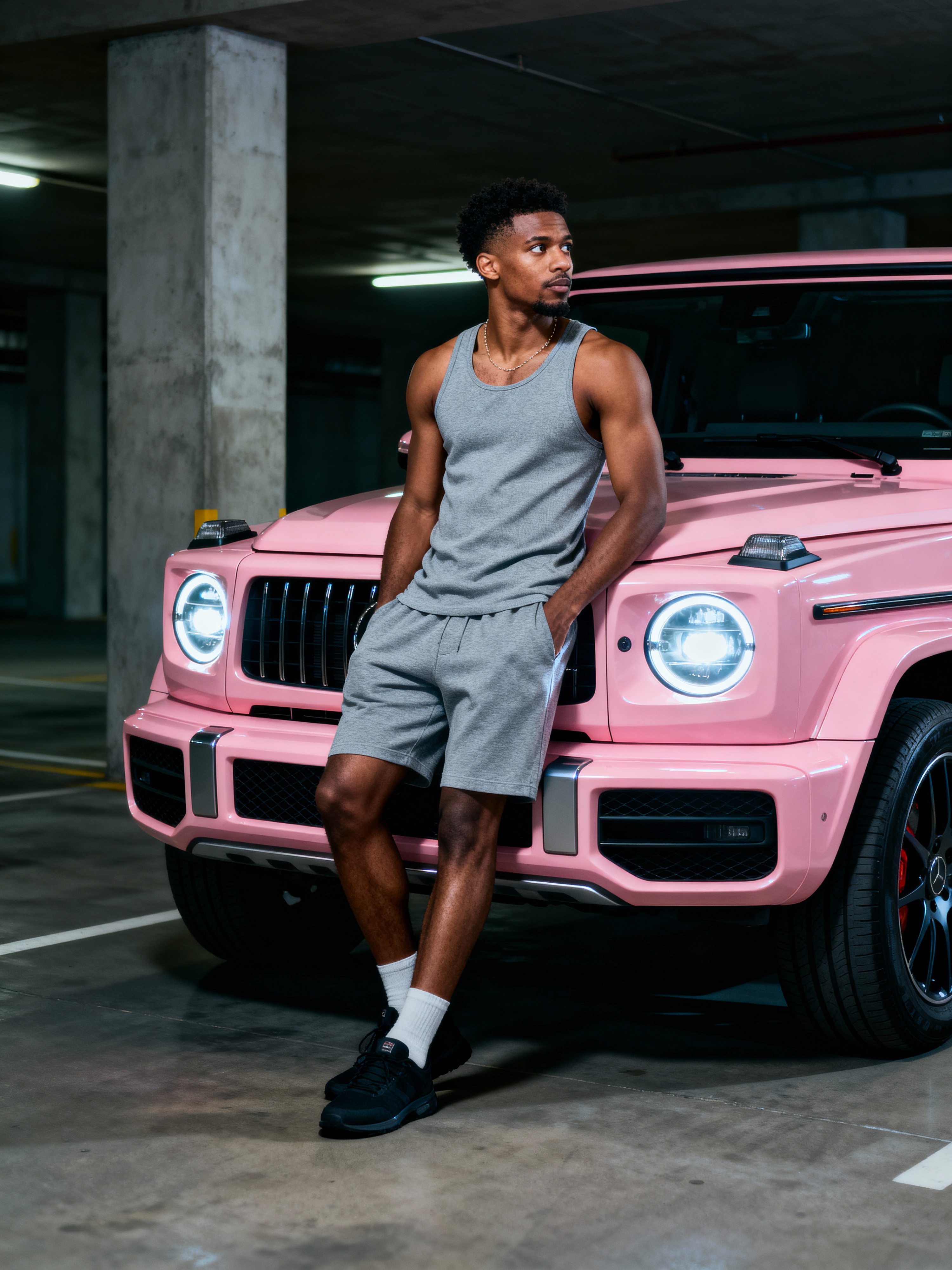 full body photo of model wearing a gray tank top and matching shorts, leaning against a pink suv. the model looks to the right. the vehicle features a modern, boxy design with a prominent front grille and round headlights. the setting is an indoor parking area with concrete columns visible in the background.