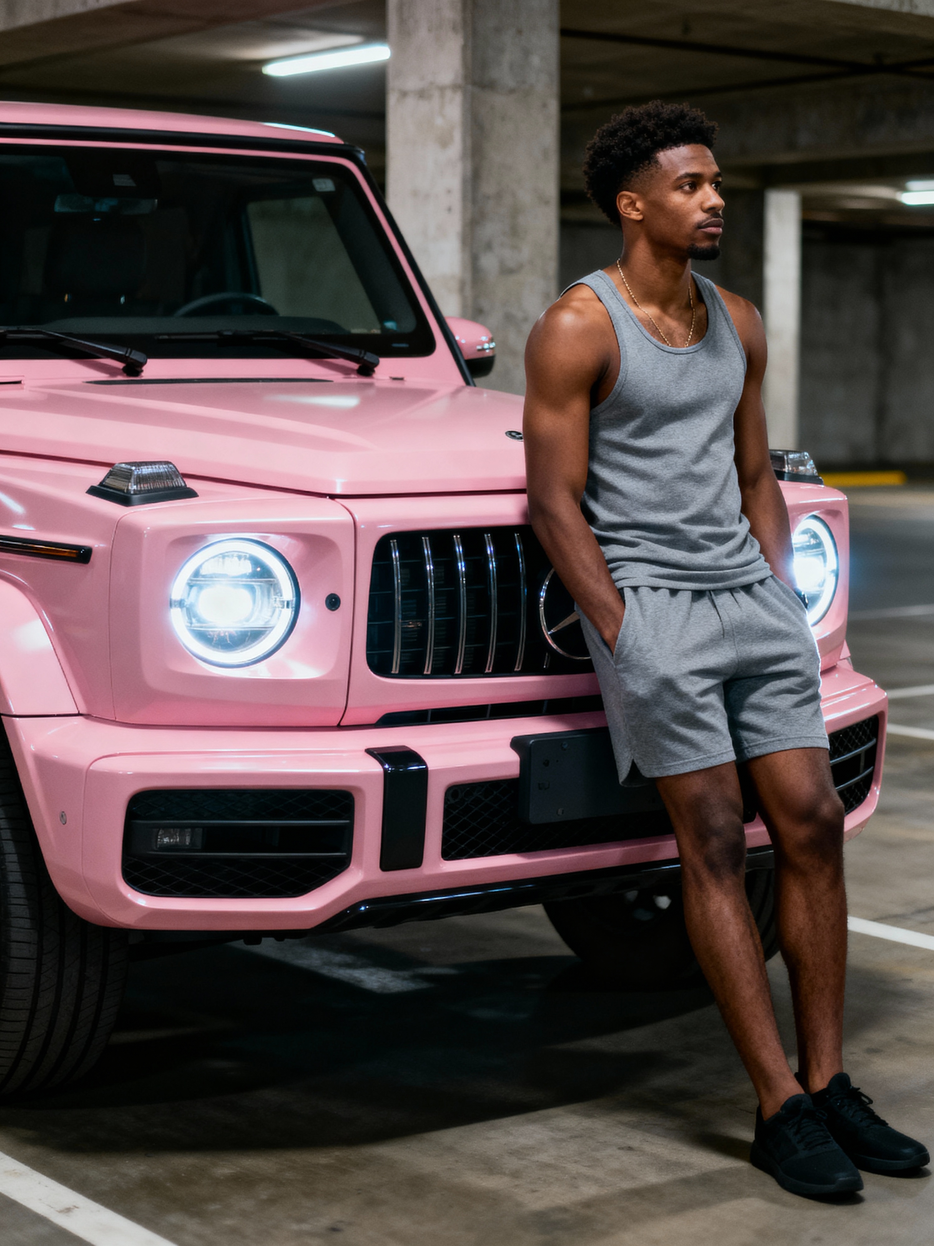 full body photo of model wearing a gray tank top and matching shorts, leaning against a pink suv. the model looks to the right. the vehicle features a modern, boxy design with a prominent front grille and round headlights. the setting is an indoor parking area with concrete columns visible in the background.