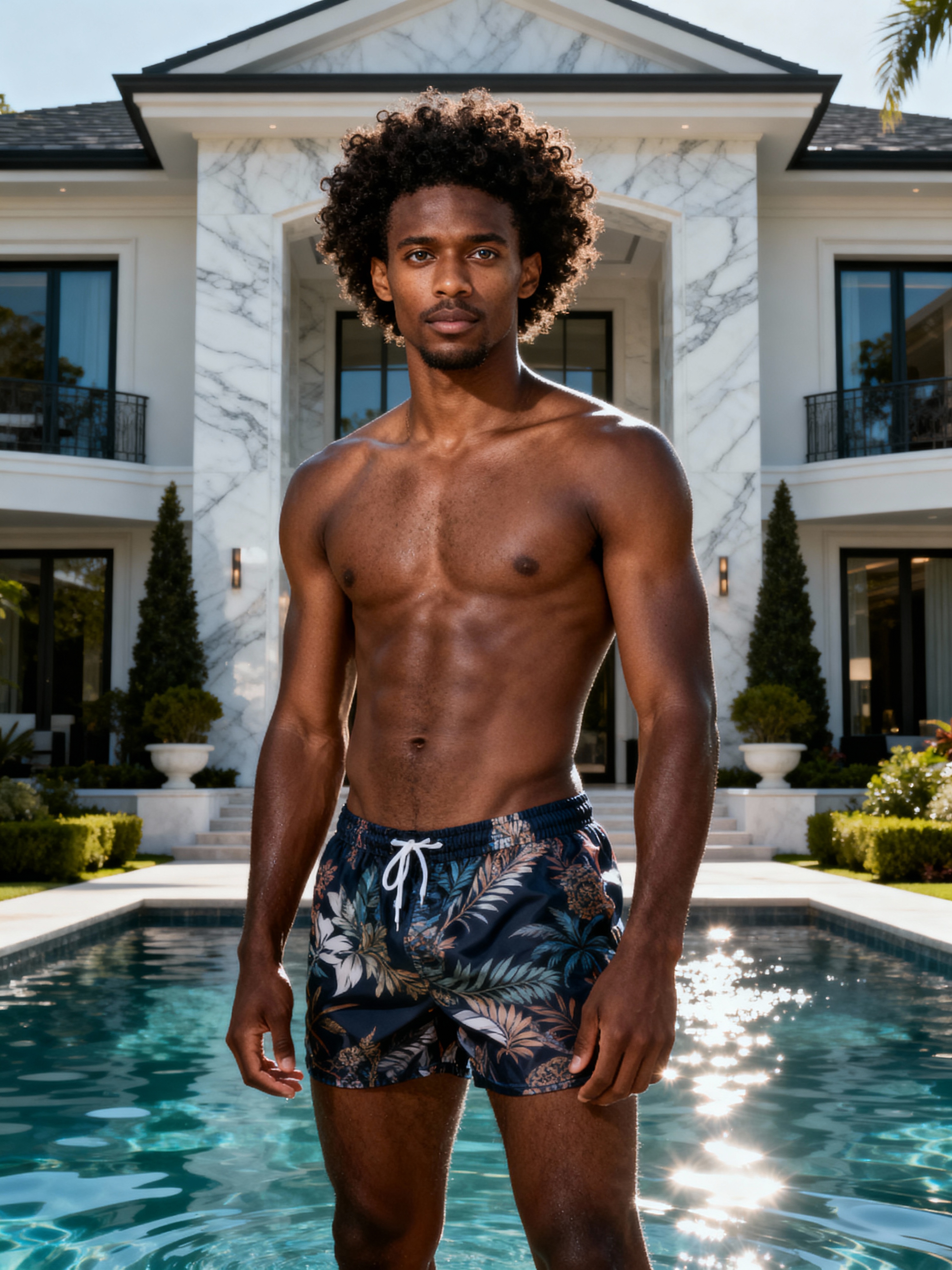 full body photo of model wearing swim shorts in front of luxury design villa