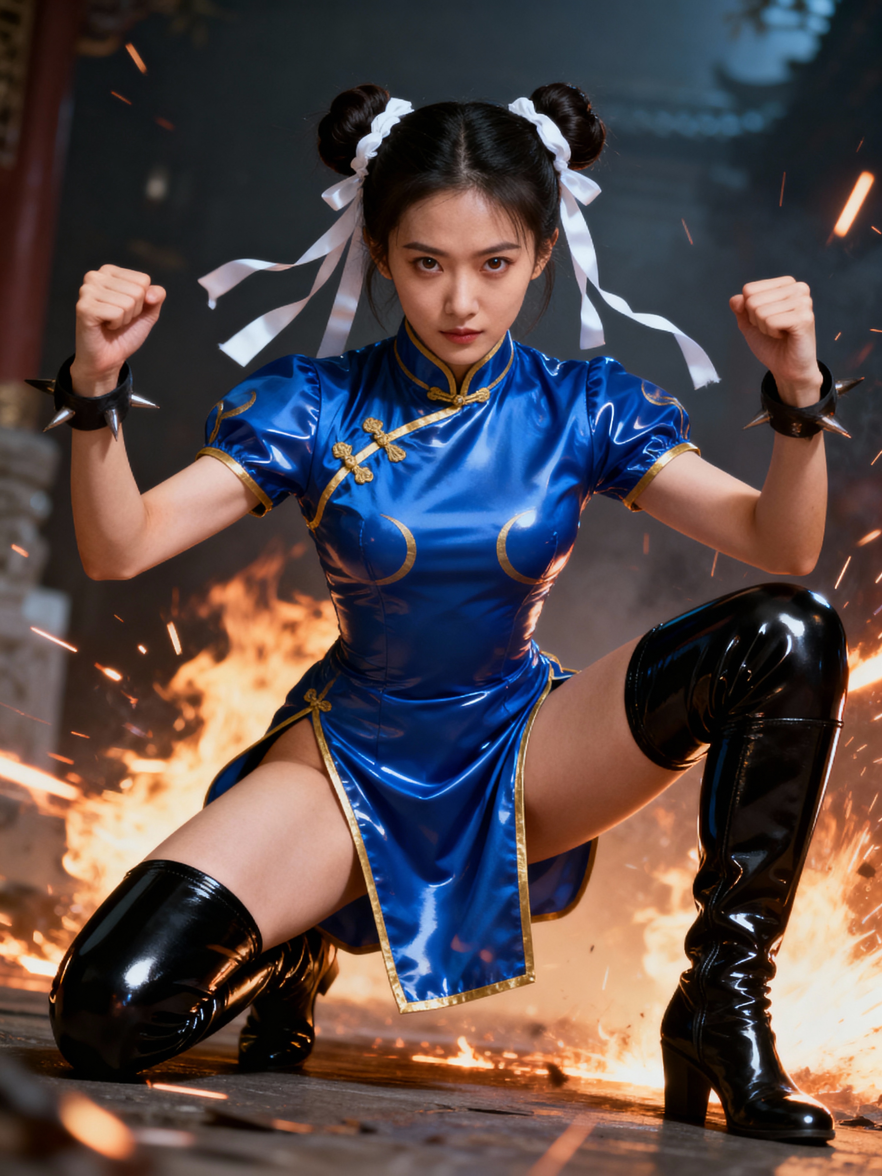 Full body photo of martial arts-themed scene featuring a model in a tight, glossy blue cheongsam-style outfit with gold trim and high slits, designed to highlight her curves and flexibility. Her hair is styled in twin buns tied with white ribbons, and she wears glossy black thigh-high boots.