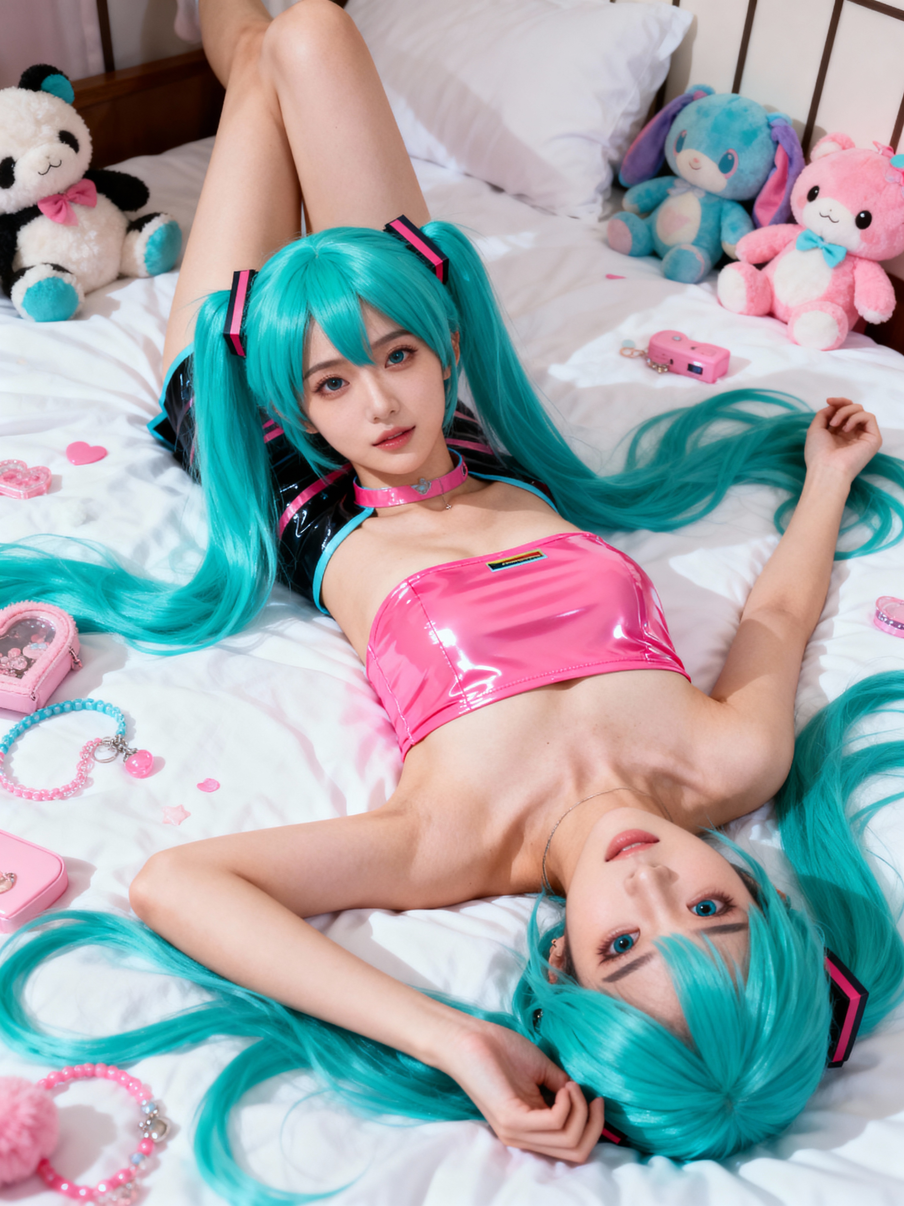 Full body photo of vibrant cosplay scene of model dressed as a flirty anime character, featuring a bright turquoise wig and a tight pink glossy crop top. She lies on white sheets with a sultry expression, surrounded by plushies and scattered pastel accessories. The soft bedroom lighting creates a dreamy, intimate glow, perfect for a playful anime aesthetic.