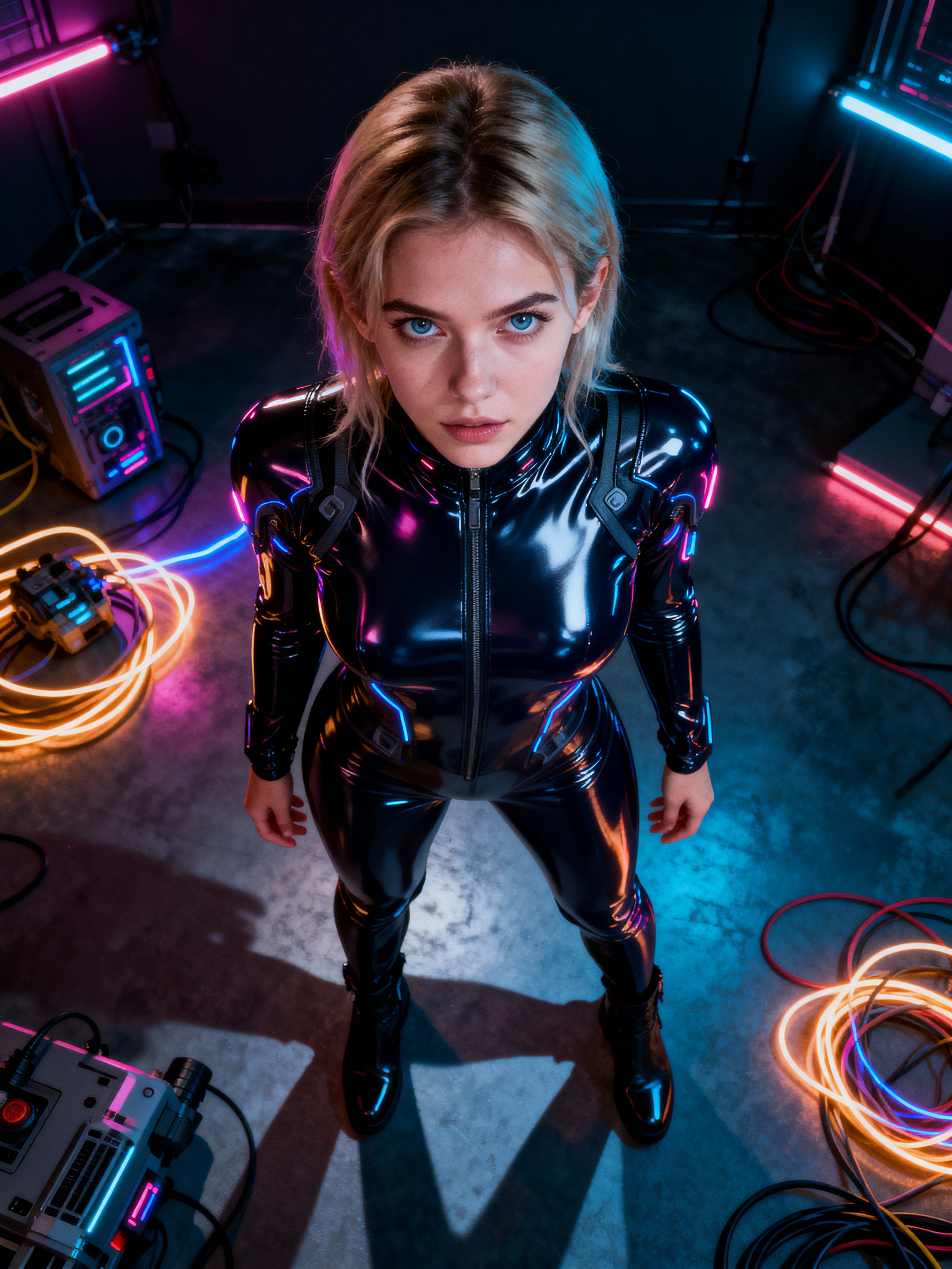 Full body photo of model in futuristic sci-fi latex glossy bodysuit illuminated by moody neon lighting. floor scattered with glowing cables and high-tech props. The scene evokes a gritty cyberpunk world with dark ambiance and electric colors, as her intense gaze pierces through the shadows.