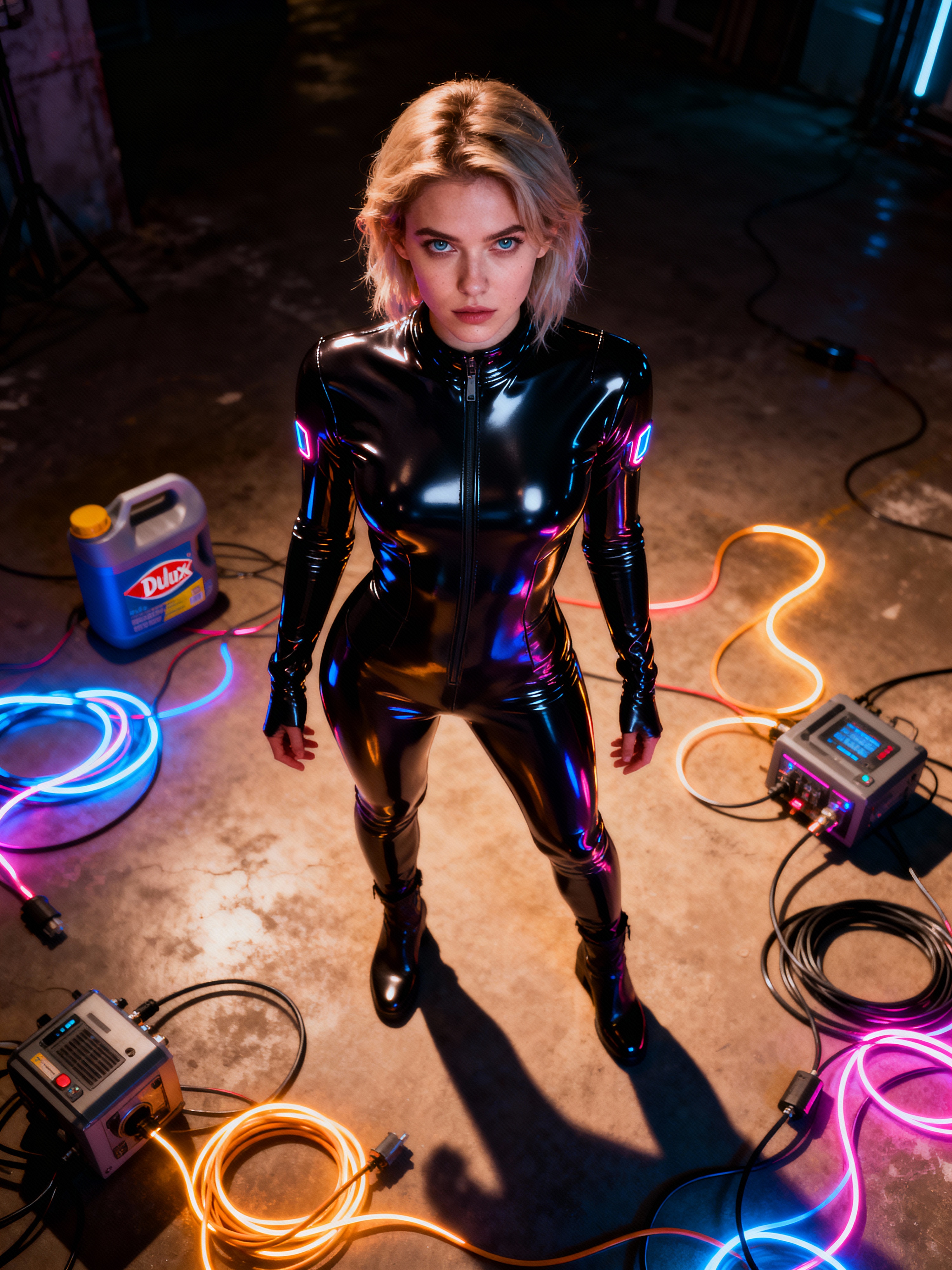 Full body photo of model in futuristic sci-fi latex glossy bodysuit illuminated by moody neon lighting. floor scattered with glowing cables and high-tech props. The scene evokes a gritty cyberpunk world with dark ambiance and electric colors, as her intense gaze pierces through the shadows.
