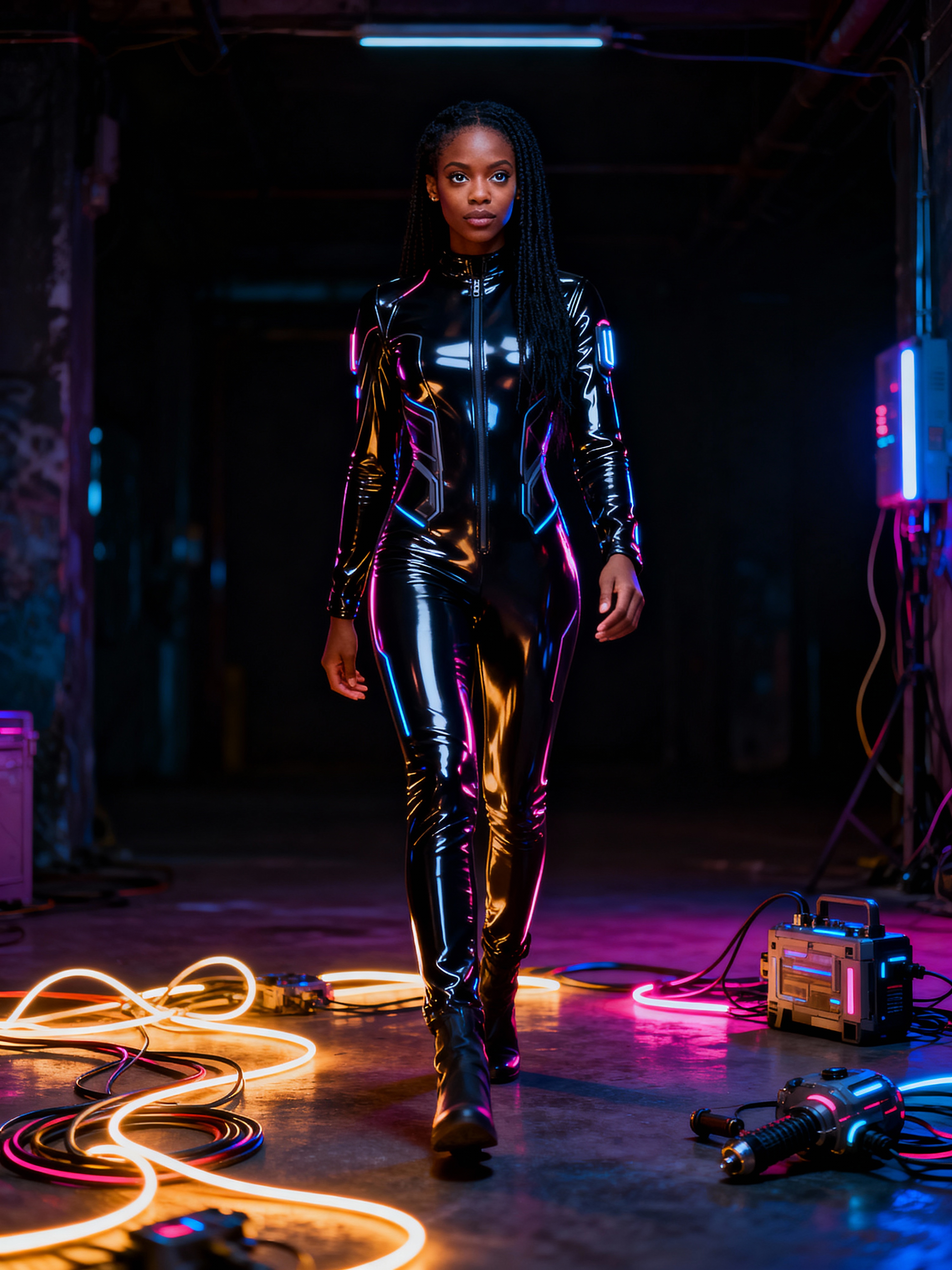 Full body photo of model in futuristic sci-fi latex glossy bodysuit illuminated by moody neon lighting. floor scattered with glowing cables and high-tech props. The scene evokes a gritty cyberpunk world with dark ambiance and electric colors, as her intense gaze pierces through the shadows.