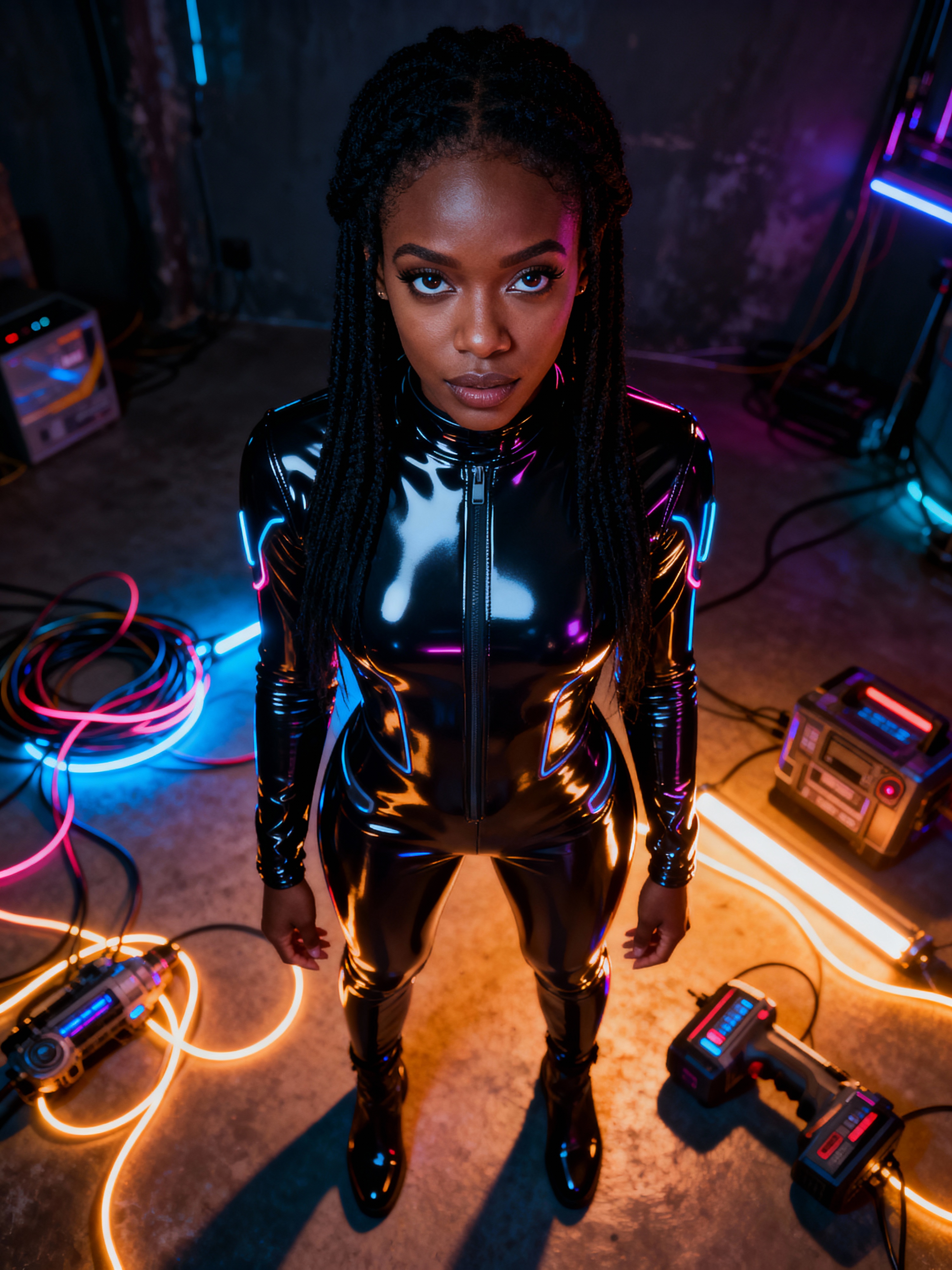 Full body photo of model in futuristic sci-fi latex glossy bodysuit illuminated by moody neon lighting. floor scattered with glowing cables and high-tech props. The scene evokes a gritty cyberpunk world with dark ambiance and electric colors, as her intense gaze pierces through the shadows.