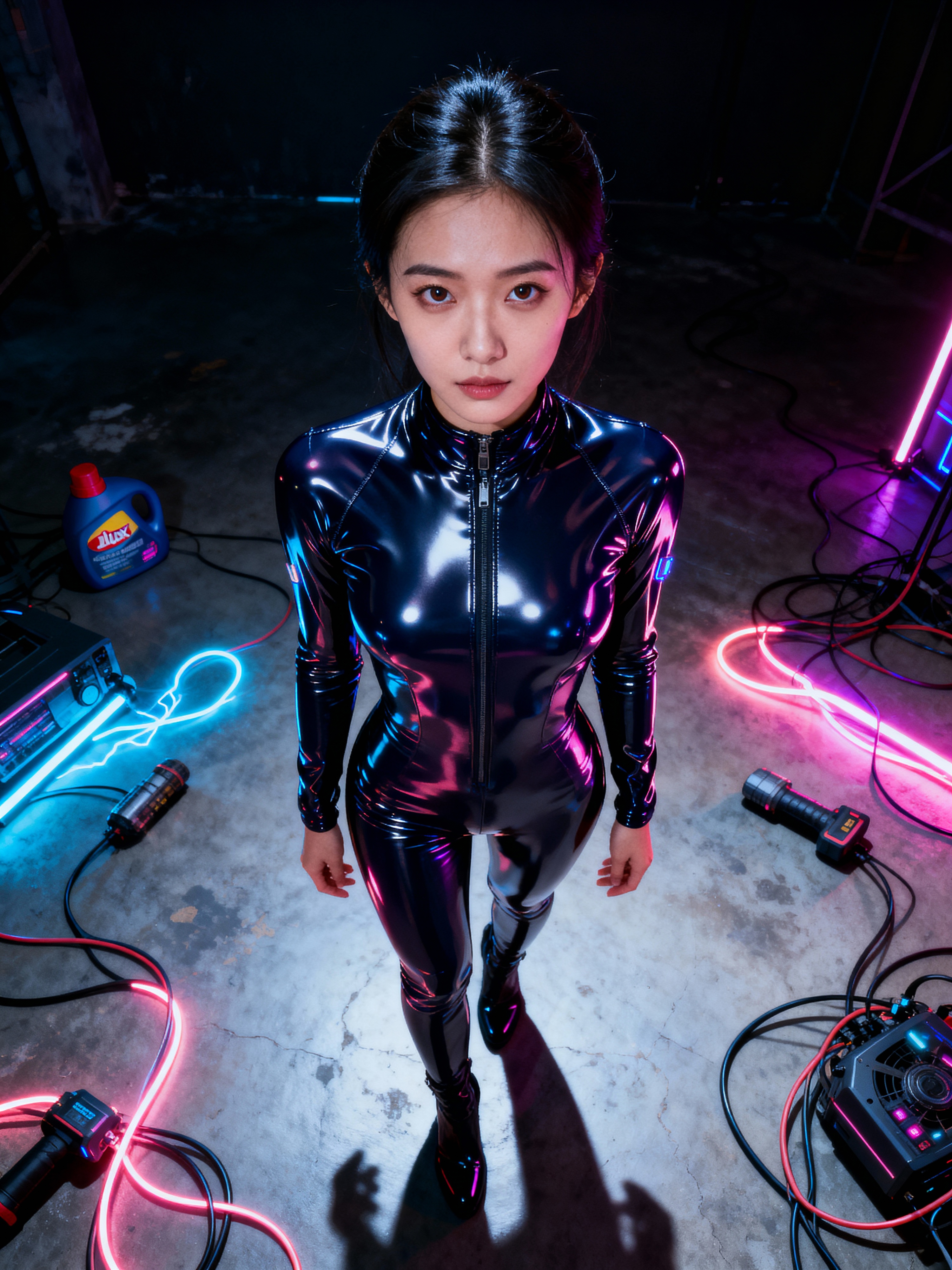 Full body photo of model in futuristic sci-fi latex glossy bodysuit illuminated by moody neon lighting. floor scattered with glowing cables and high-tech props. The scene evokes a gritty cyberpunk world with dark ambiance and electric colors, as her intense gaze pierces through the shadows.