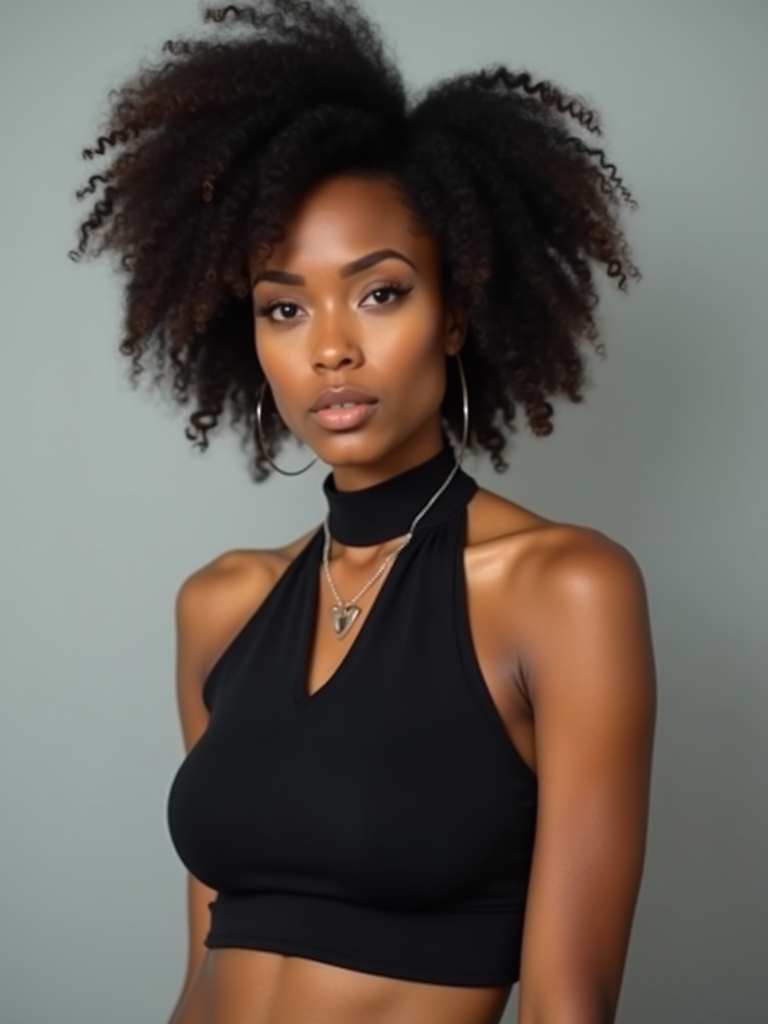 full body photo of model is looking directly at the camera and has styled her hair with volume and a slight wave. Wearing a black halter-style crop top and a black choker necklace with a small pendant. The background is a plain, light gray color, creating a minimalist setting.