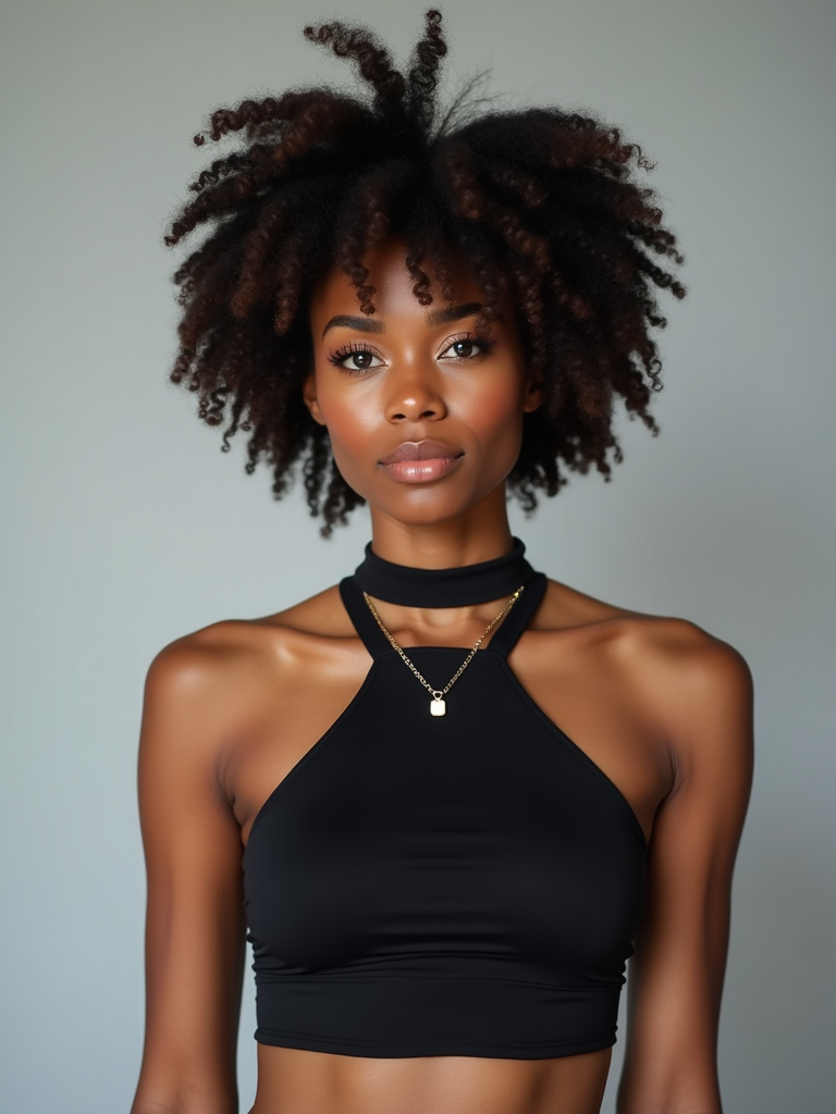 full body photo of model is looking directly at the camera and has styled her hair with volume and a slight wave. Wearing a black halter-style crop top and a black choker necklace with a small pendant. The background is a plain, light gray color, creating a minimalist setting.