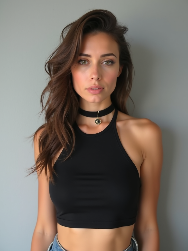 full body photo of model is looking directly at the camera and has styled her hair with volume and a slight wave. Wearing a black halter-style crop top and a black choker necklace with a small pendant. The background is a plain, light gray color, creating a minimalist setting.