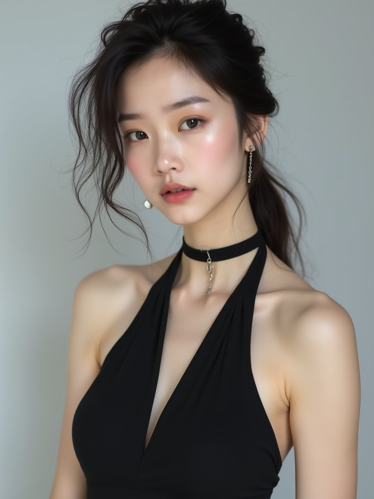 full body photo of model is looking directly at the camera and has styled her hair with volume and a slight wave. Wearing a black halter-style crop top and a black choker necklace with a small pendant. The background is a plain, light gray color, creating a minimalist setting.