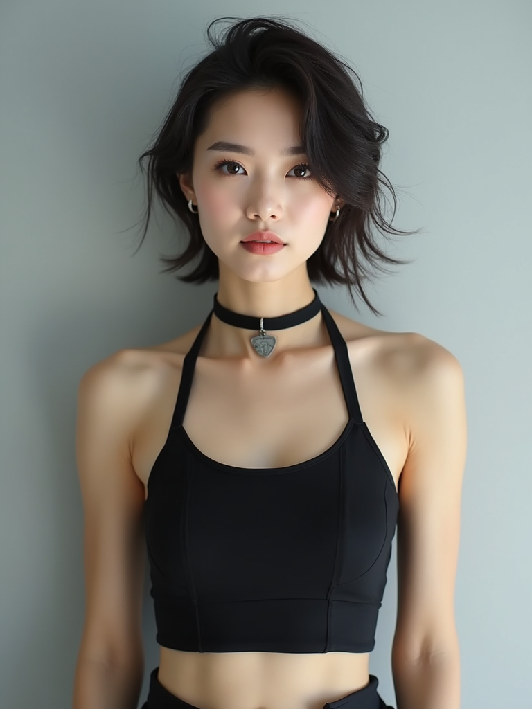 full body photo of model is looking directly at the camera and has styled her hair with volume and a slight wave. Wearing a black halter-style crop top and a black choker necklace with a small pendant. The background is a plain, light gray color, creating a minimalist setting.