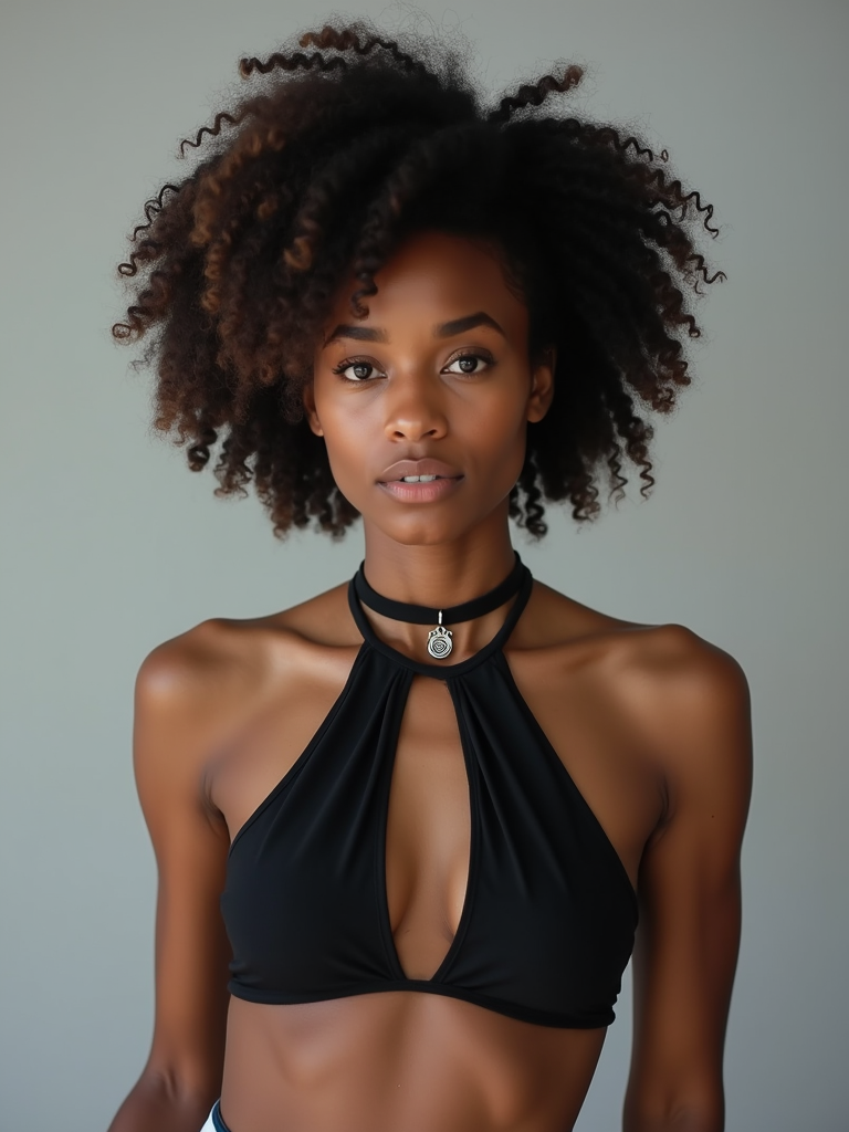 full body photo of model is looking directly at the camera and has styled her hair with volume and a slight wave. Wearing a black halter-style crop top and a black choker necklace with a small pendant. The background is a plain, light gray color, creating a minimalist setting.