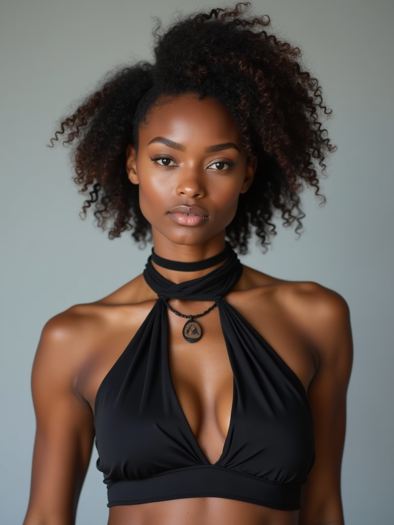 full body photo of model is looking directly at the camera and has styled her hair with volume and a slight wave. Wearing a black halter-style crop top and a black choker necklace with a small pendant. The background is a plain, light gray color, creating a minimalist setting.