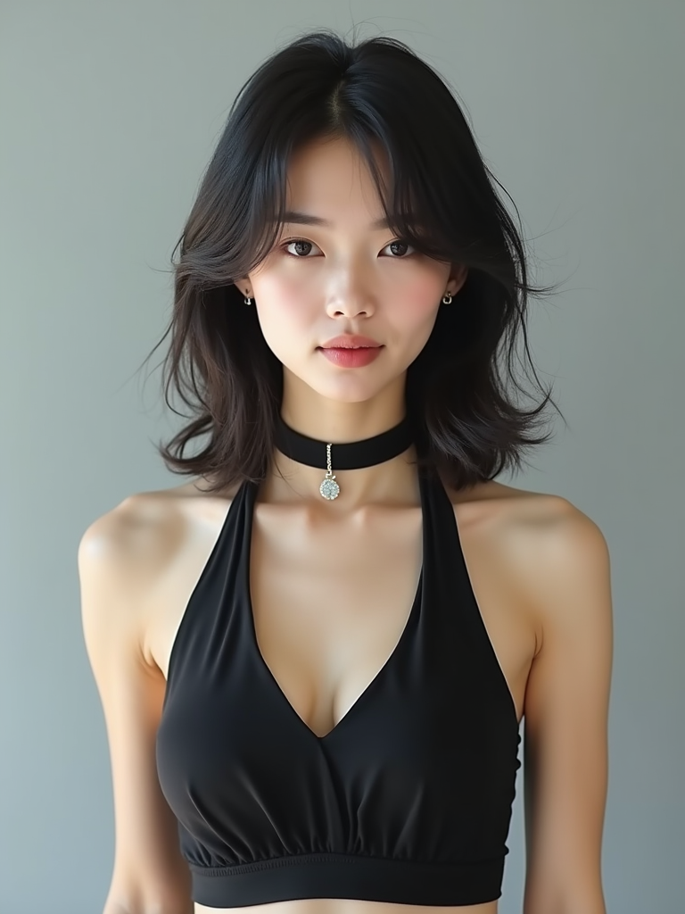 full body photo of model is looking directly at the camera and has styled her hair with volume and a slight wave. Wearing a black halter-style crop top and a black choker necklace with a small pendant. The background is a plain, light gray color, creating a minimalist setting.