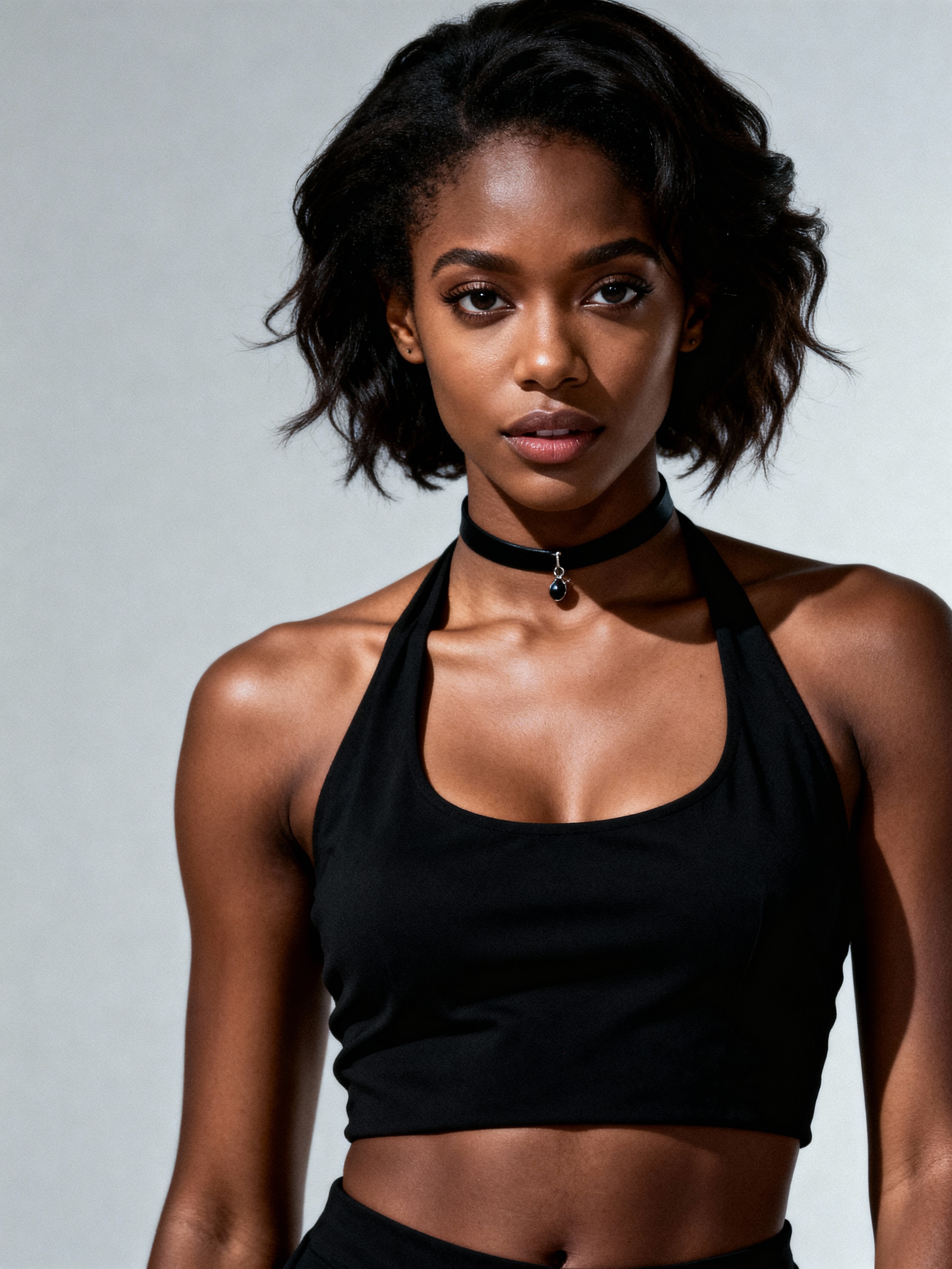 full body photo of model is looking directly at the camera and has styled her hair with volume and a slight wave. Wearing a black halter-style crop top and a black choker necklace with a small pendant. The background is a plain, light gray color, creating a minimalist setting.