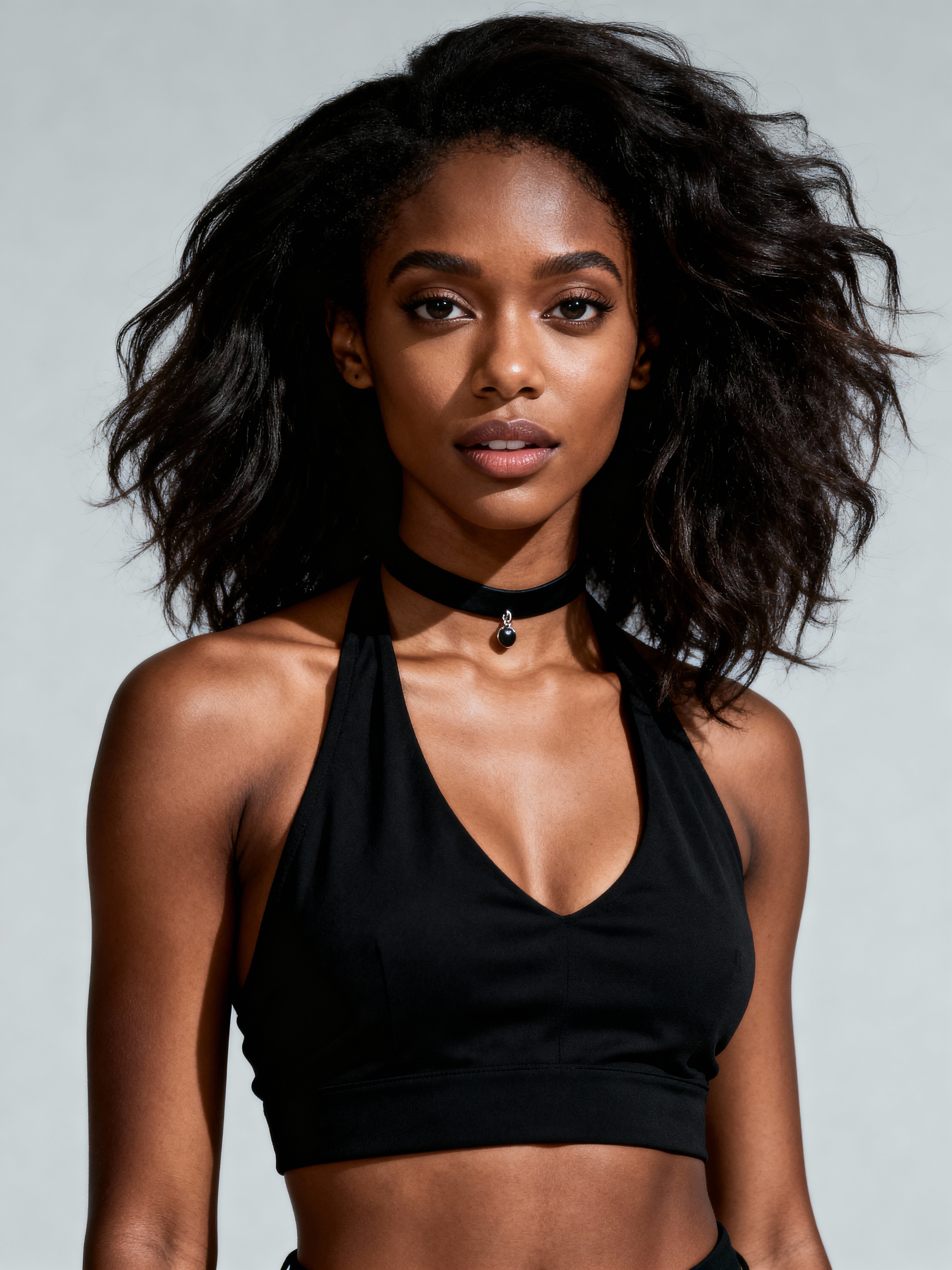 full body photo of model is looking directly at the camera and has styled her hair with volume and a slight wave. Wearing a black halter-style crop top and a black choker necklace with a small pendant. The background is a plain, light gray color, creating a minimalist setting.