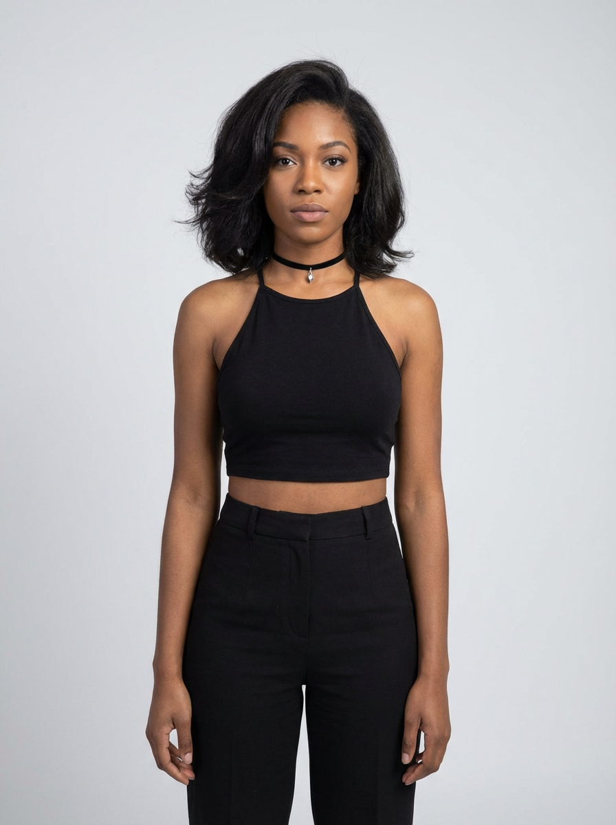 full body photo of model is looking directly at the camera and has styled her hair with volume and a slight wave. Wearing a black halter-style crop top and a black choker necklace with a small pendant. The background is a plain, light gray color, creating a minimalist setting.