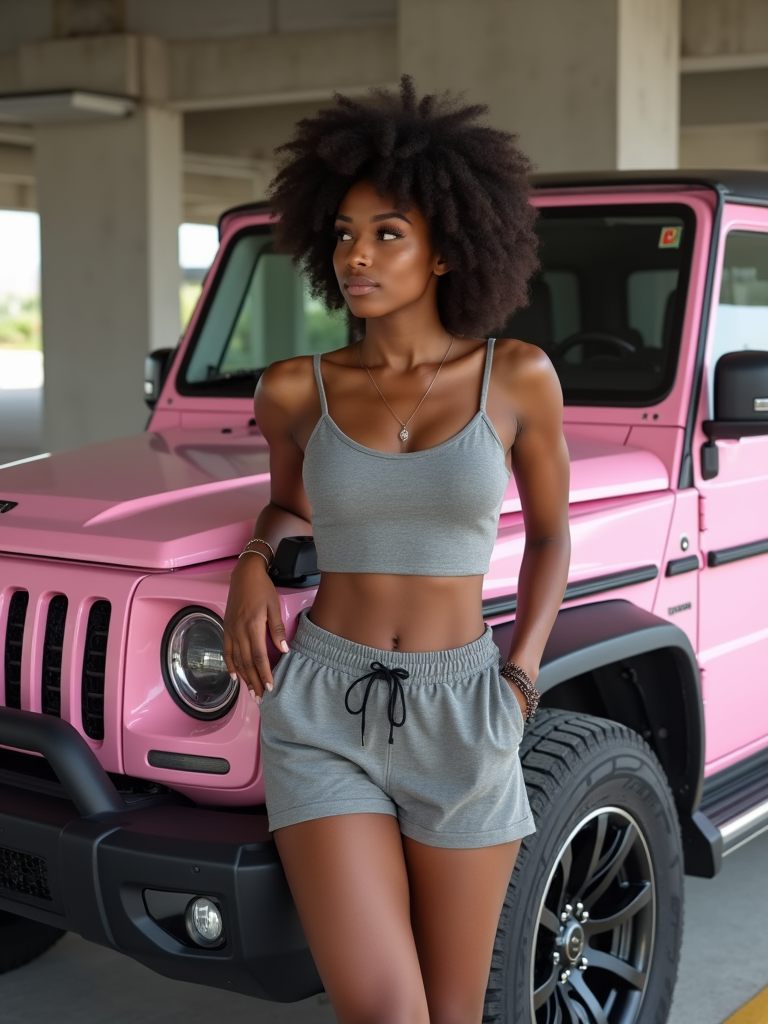 full body photo of model wearing a gray crop top and matching shorts, leaning against a pink suv. the model looks to the right. the vehicle features a modern, boxy design with a prominent front grille and round headlights. the setting is an indoor parking area with concrete columns visible in the background.