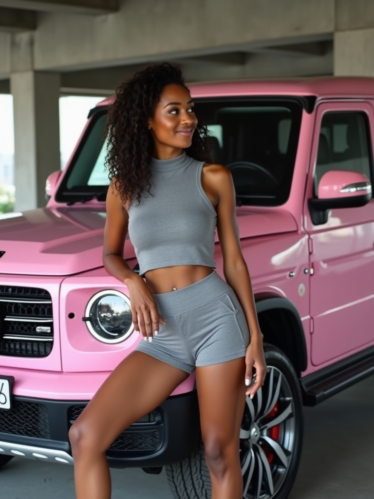 full body photo of model wearing a gray crop top and matching shorts, leaning against a pink suv. the model looks to the right. the vehicle features a modern, boxy design with a prominent front grille and round headlights. the setting is an indoor parking area with concrete columns visible in the background.