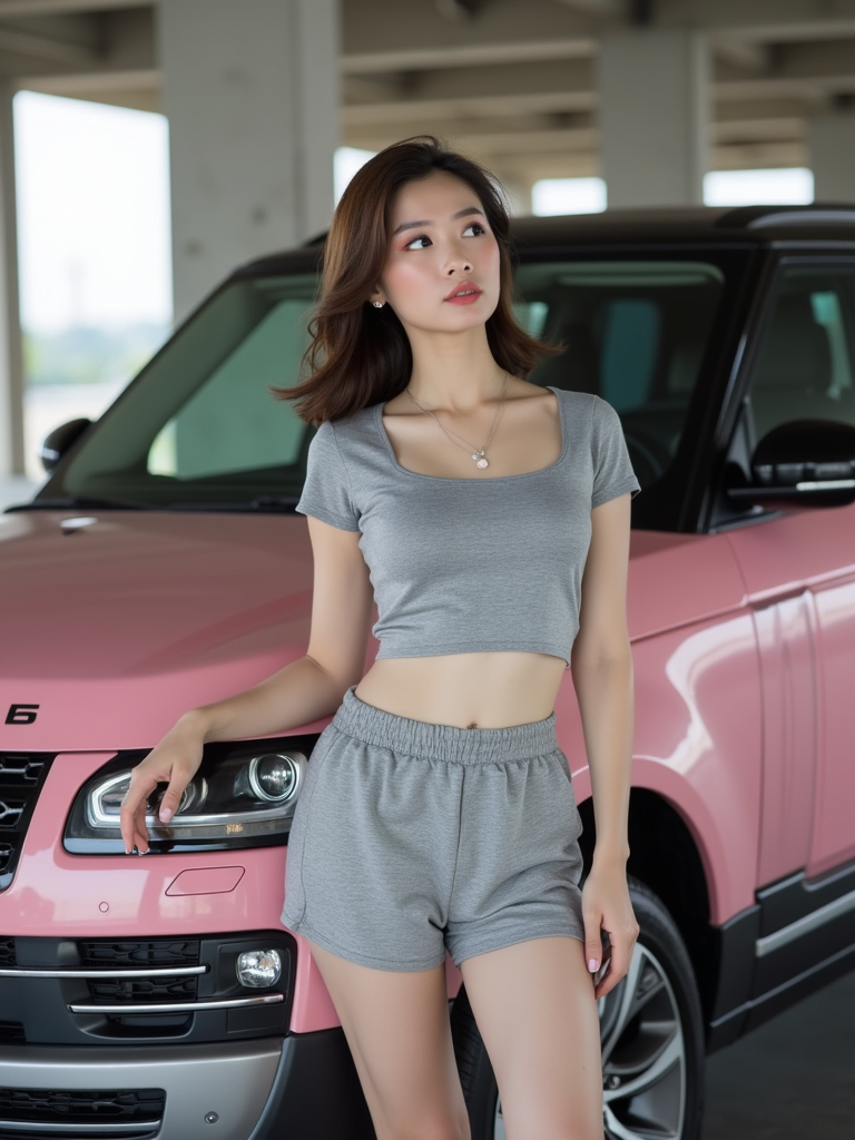 full body photo of model wearing a gray crop top and matching shorts, leaning against a pink suv. the model looks to the right. the vehicle features a modern, boxy design with a prominent front grille and round headlights. the setting is an indoor parking area with concrete columns visible in the background.