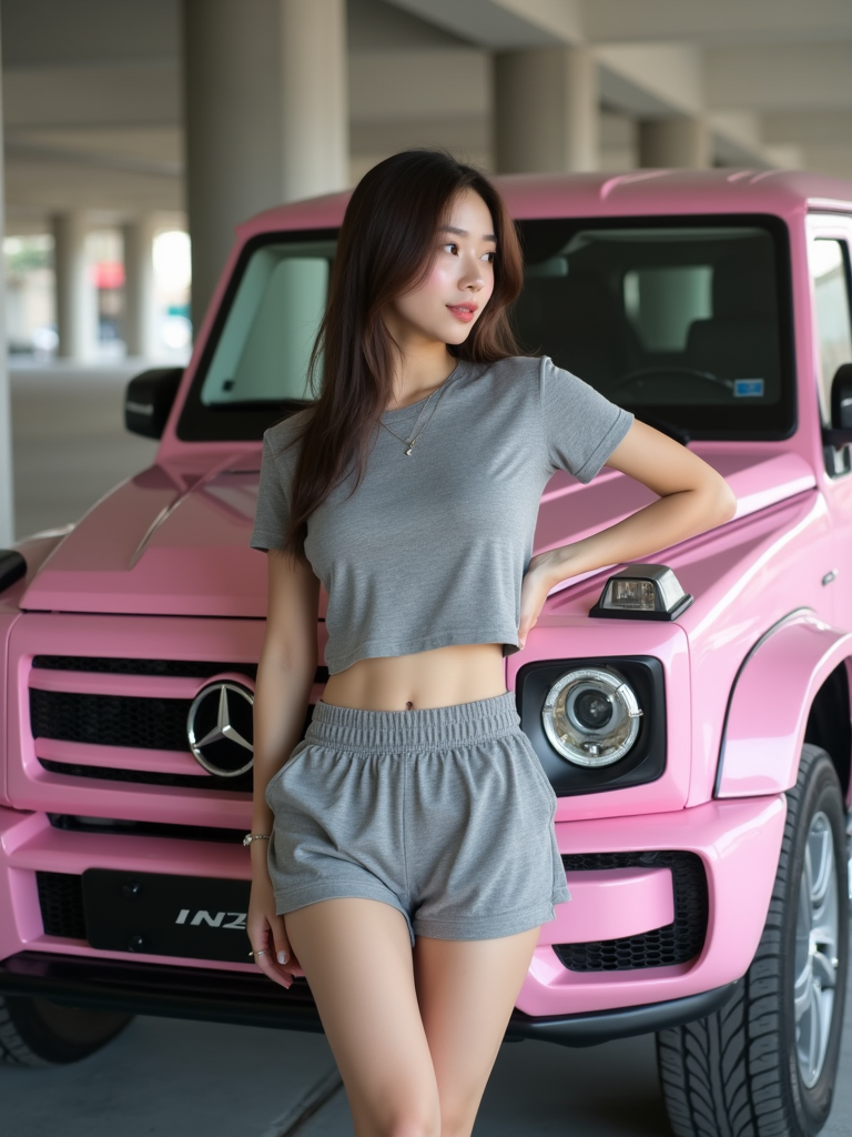 full body photo of model wearing a gray crop top and matching shorts, leaning against a pink suv. the model looks to the right. the vehicle features a modern, boxy design with a prominent front grille and round headlights. the setting is an indoor parking area with concrete columns visible in the background.