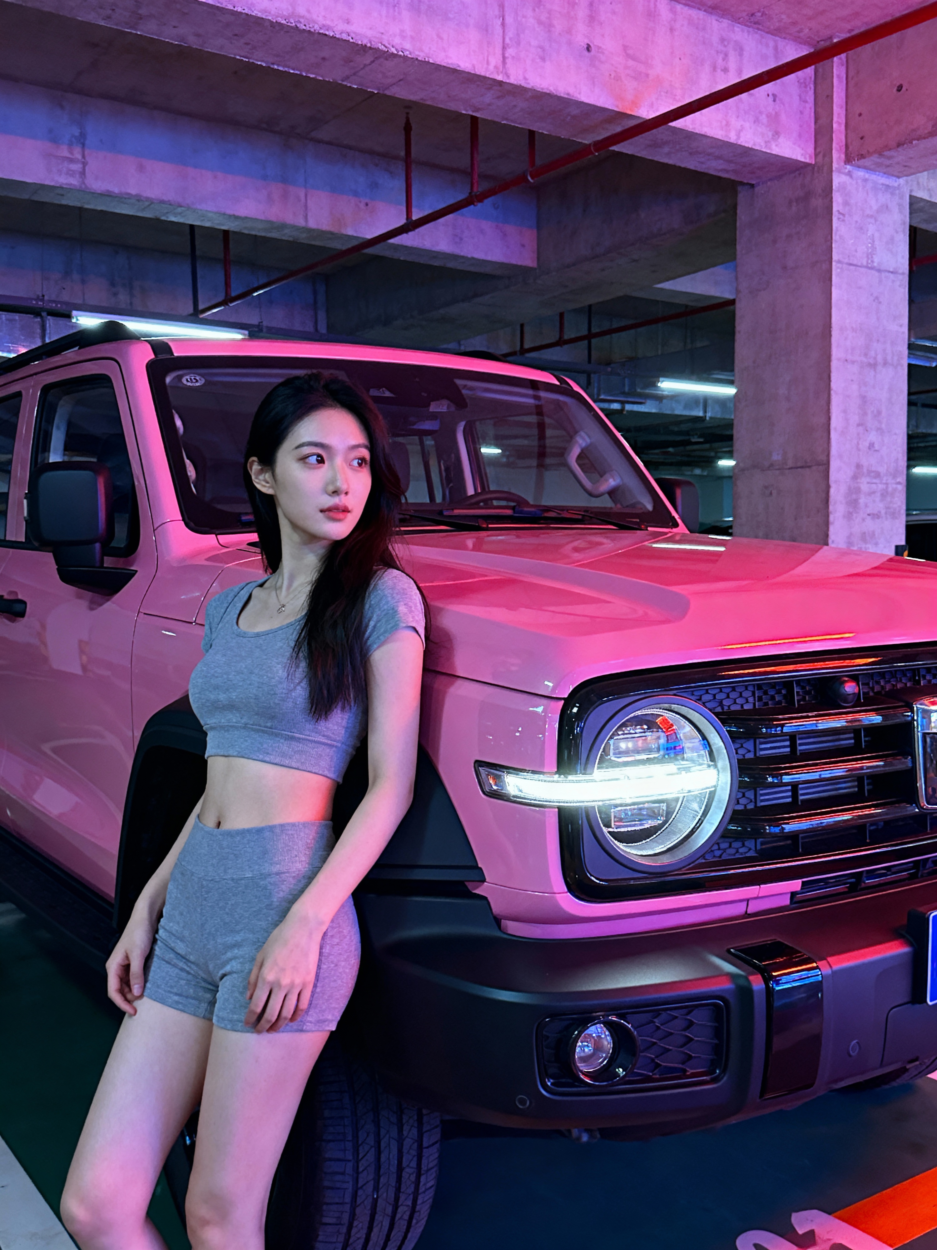 full body photo of model wearing a gray crop top and matching shorts, leaning against a pink suv. the model looks to the right. the vehicle features a modern, boxy design with a prominent front grille and round headlights. the setting is an indoor parking area with concrete columns visible in the background.
