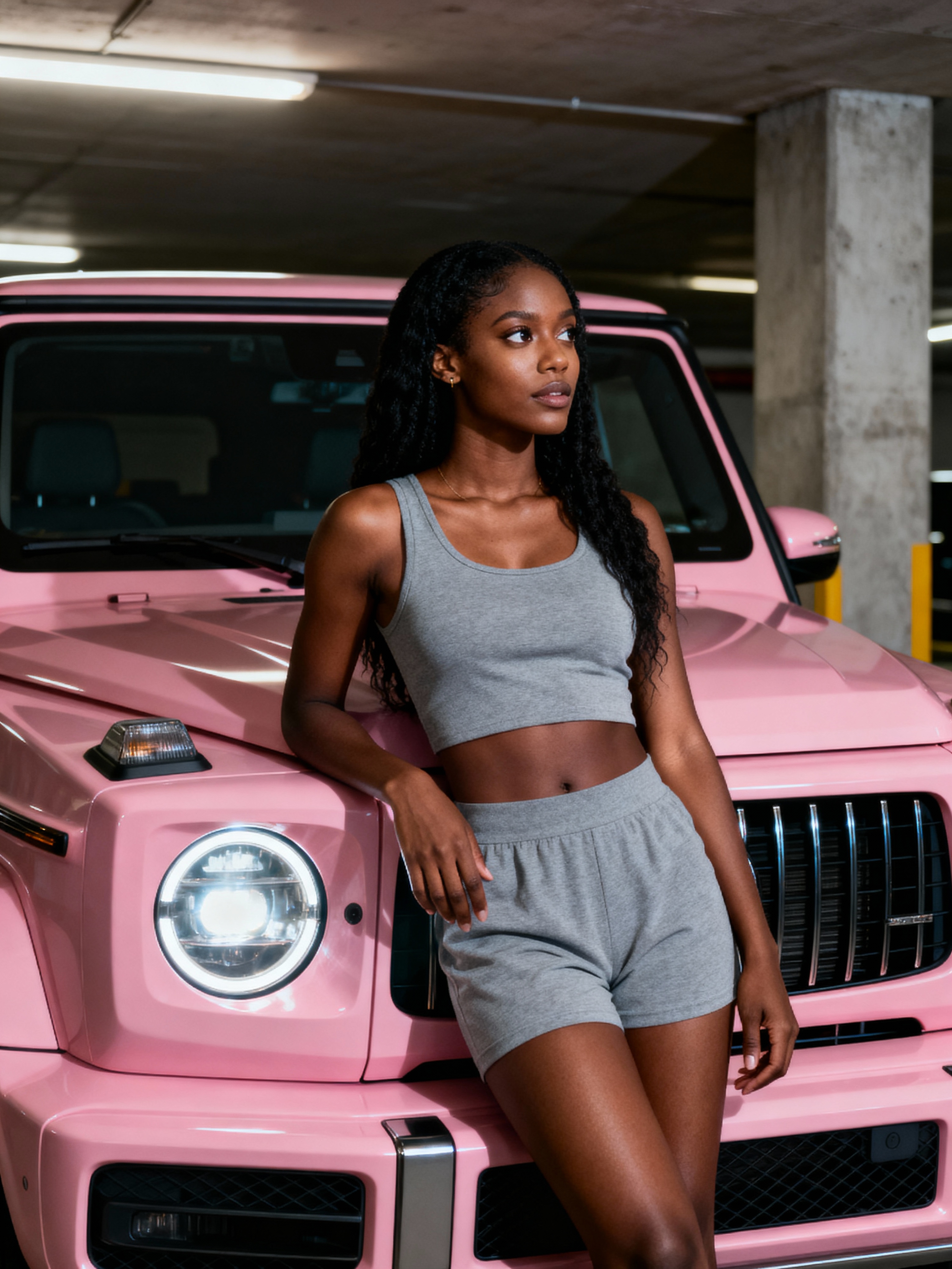 full body photo of model wearing a gray crop top and matching shorts, leaning against a pink suv. the model looks to the right. the vehicle features a modern, boxy design with a prominent front grille and round headlights. the setting is an indoor parking area with concrete columns visible in the background.