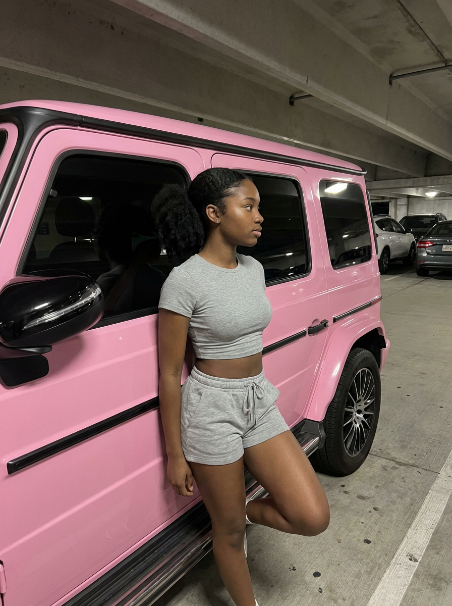full body photo of model wearing a gray crop top and matching shorts, leaning against a pink suv. the model looks to the right. the vehicle features a modern, boxy design with a prominent front grille and round headlights. the setting is an indoor parking area with concrete columns visible in the background.
