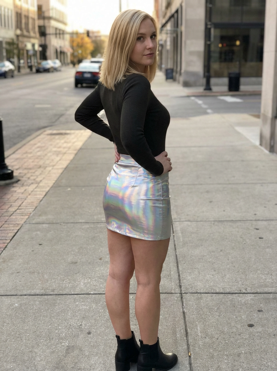 full body photo side view of model posing for photo. she is wearing holographic, glossy reflective, mini skirt that mirrors the surroundings. she is posed in a way that emphasizes their perfect body shapes, exaggerated buttocks.