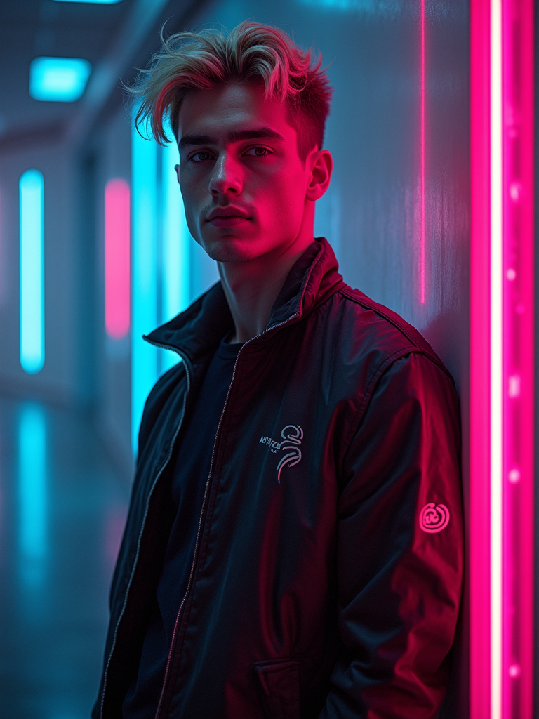 Full body portrait of model as a digital art piece. Cyberpunk aesthetic, neon accents. Modern digital art style.