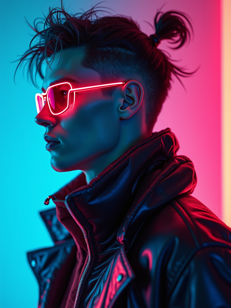 Full body portrait of model as a digital art piece. Cyberpunk aesthetic, neon accents. Modern digital art style.