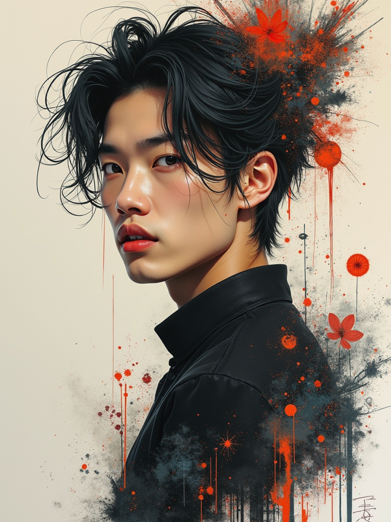 Full body portrait of model as a mixed media artwork. Combined techniques, artistic depth. Contemporary art style.