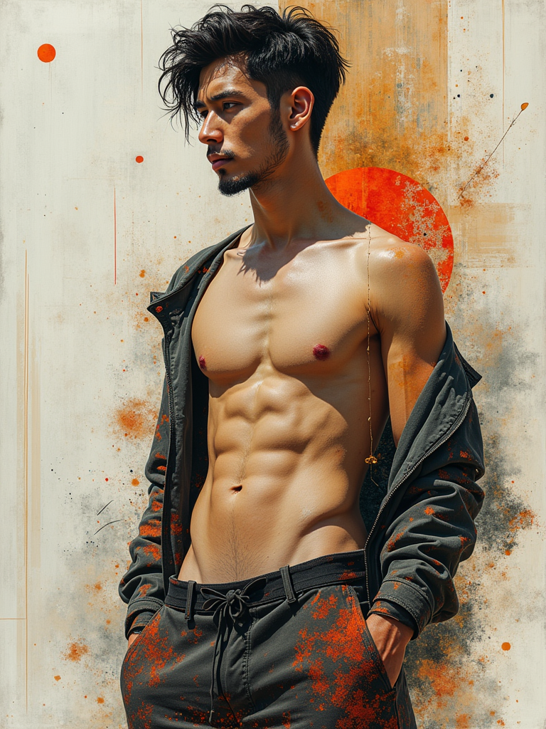 Full body portrait of model as a mixed media artwork. Layered elements, creative composition. Gallery quality art.