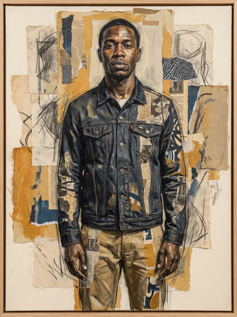 Full body portrait of model as a mixed media artwork. Layered elements, creative composition. Gallery quality art.