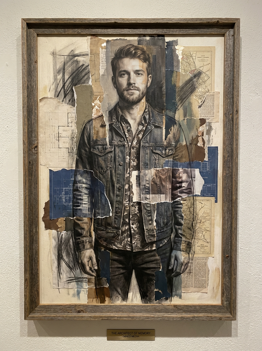 Full body portrait of model as a mixed media artwork. Layered elements, creative composition. Gallery quality art.