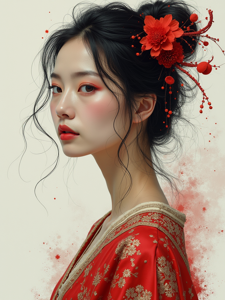 Full body portrait of model as a contemporary art piece. Abstract elements, artistic composition . Gallery quality artwork.
