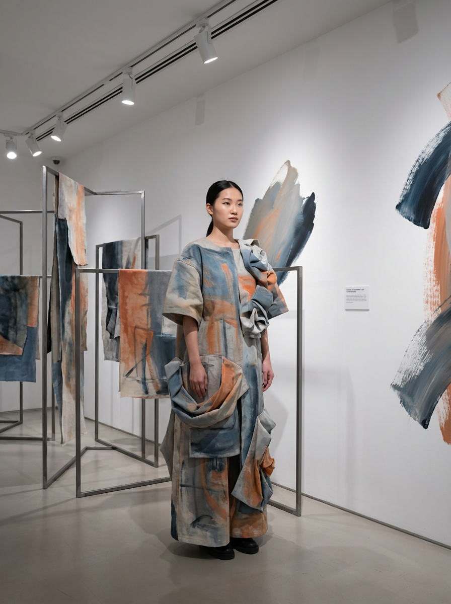 Full body portrait of model as a contemporary art piece. Abstract elements, artistic composition . Gallery quality artwork.