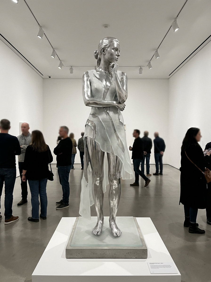 Full body portrait of model as a contemporary sculpture. Modern materials, artistic form . Gallery installation style.