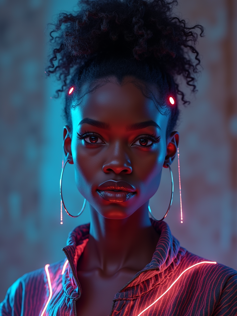 Full body portrait of model as a digital art piece. Futuristic style, glowing elements . Modern digital art style.