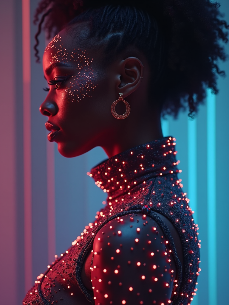 Full body portrait of model as a digital art piece. Futuristic style, glowing elements . Modern digital art style.