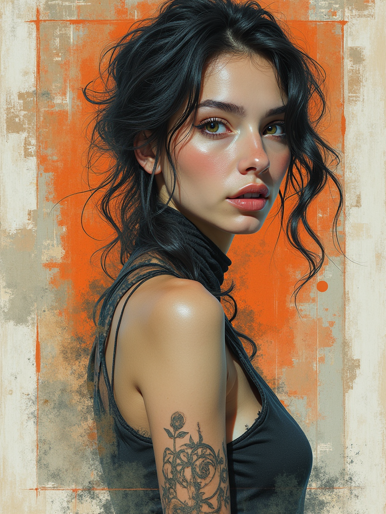 Full body portrait of model as a mixed media artwork. Collage elements, textured layers . Contemporary art style.
