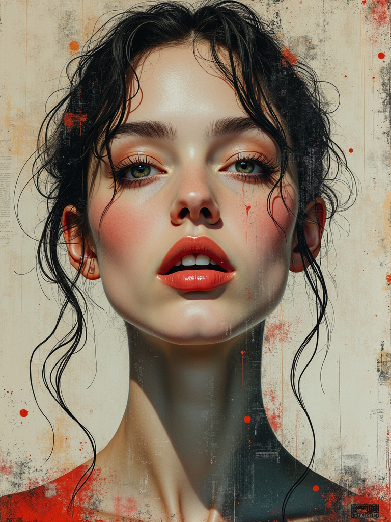 Full body portrait of model as a mixed media artwork. Collage elements, textured layers . Contemporary art style.