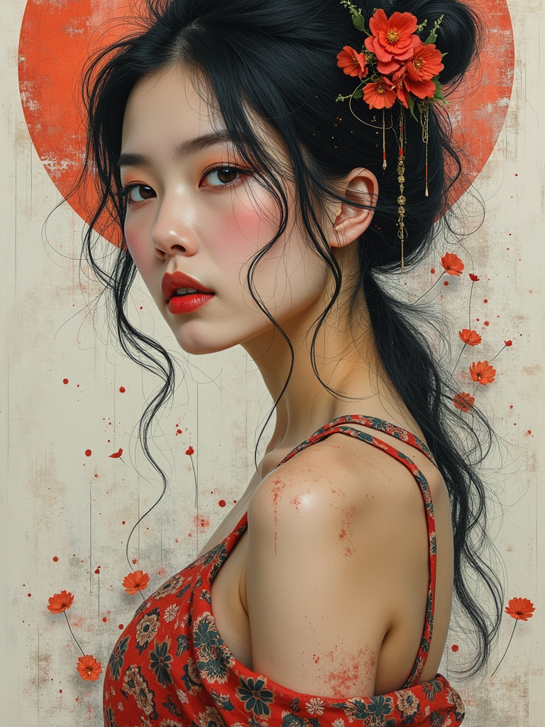 Full body portrait of model as a mixed media artwork. Collage elements, textured layers . Contemporary art style.