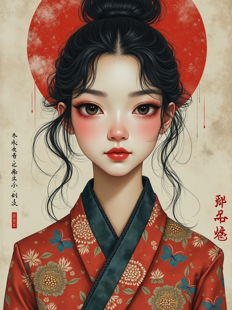 Full body portrait of model as a mixed media artwork. Collage elements, textured layers . Contemporary art style.