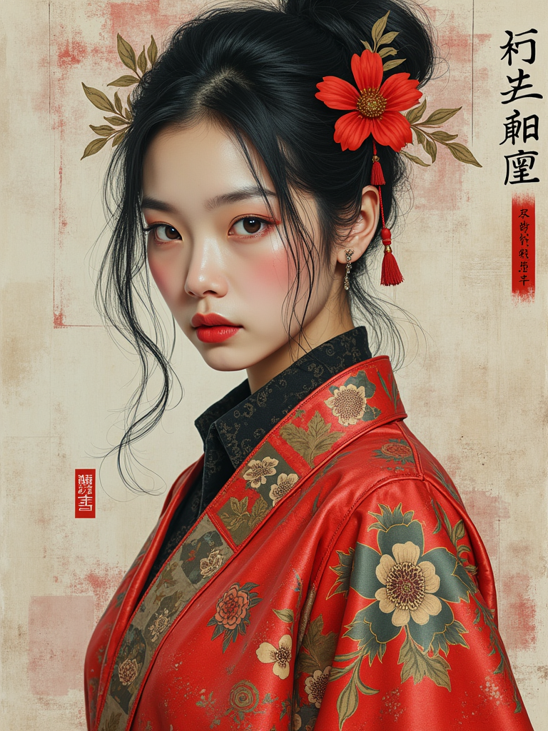 Full body portrait of model as a mixed media artwork. Collage elements, textured layers . Contemporary art style.